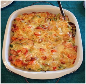 Pølsegrateng med grønnsaker servert med nykokte poteter er en høydare og en fin måte å få barna til å spise grønnsaker. Det meste av grønnsaker kan brukes. Dersom du har lyst å gjøre den ekstra spennende kan du bruke chorizo-pølser og nøkkelost. Du må kanskje da redusere litt på pølsemengden.