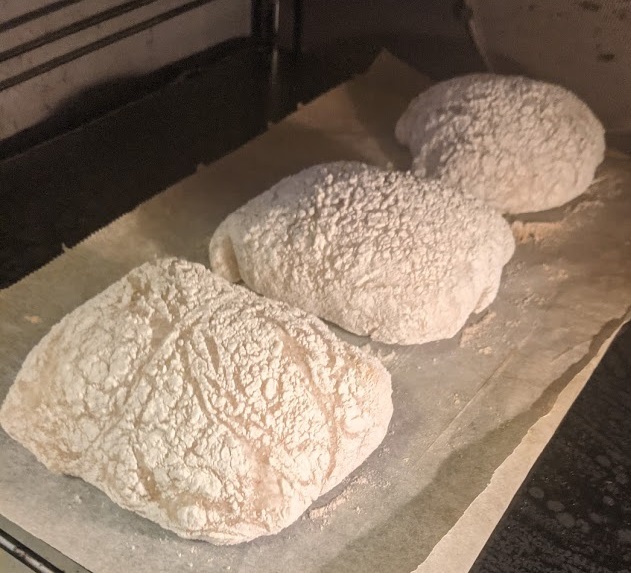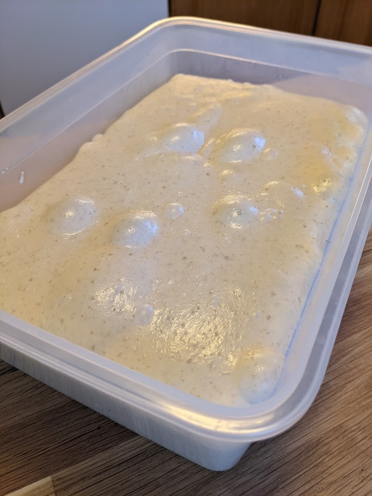La deigen hvile til dobbel størrelse, lager du deigen om kvelden kan du la den hvile på kjøkkenbenken til neste dag. (Tar ca 6 timer) Hvis en har mulighete ville jeg satt deigen enten et svalt sted, f.eks kjelleren alternativt i kjøleskapet og heller hevet den litt lenger på benk dagen etter.