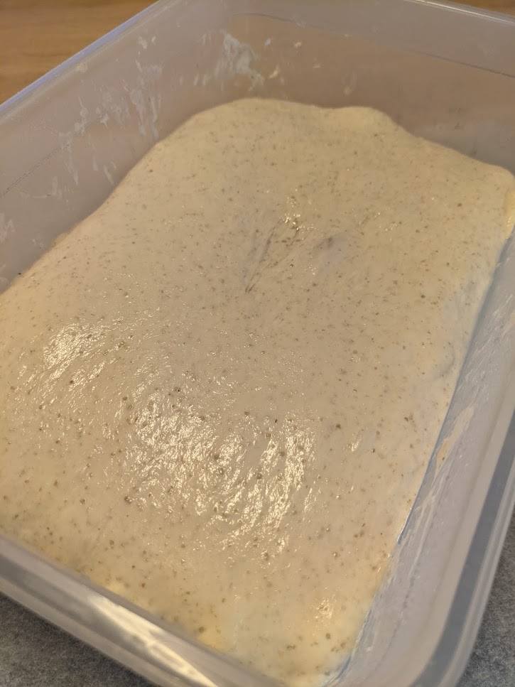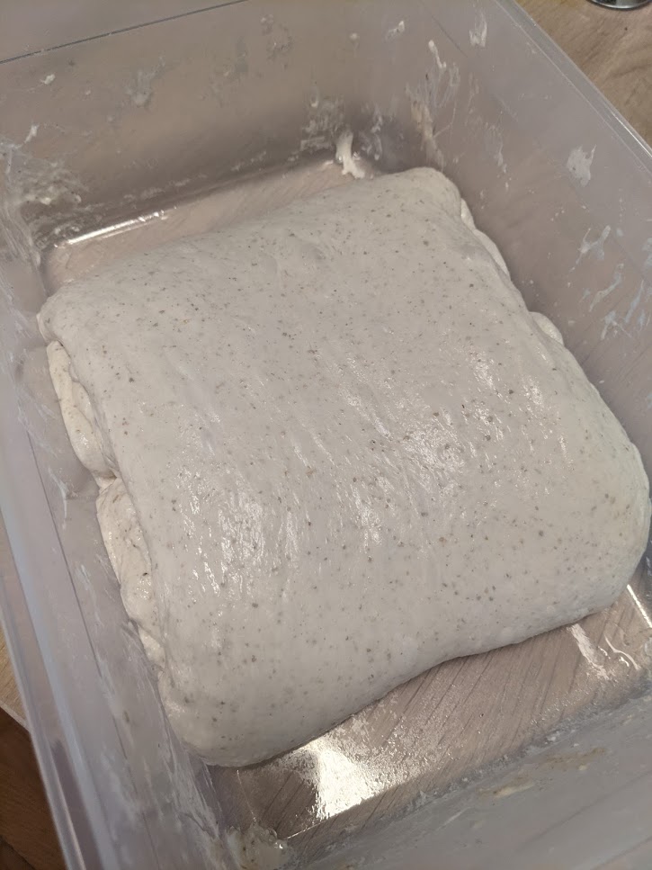 De neste to timene skal du gjøre strekk og fold 3-4 ganger. La deigen heve på kjøkkenbordet i noen timer (regn med 2-3 timer ytterlig utover de første 2 timene. Når det har gått 2-3 timer fra du hadde deigen over i boksen/skålen kan du klippe av en liten bit deig. Denne legges i et glass med lunka/romtemperert vann. Når den stiger til overflaten, er deigen klar til å settes i kjøleskapet. Deigen forblir i boksen..