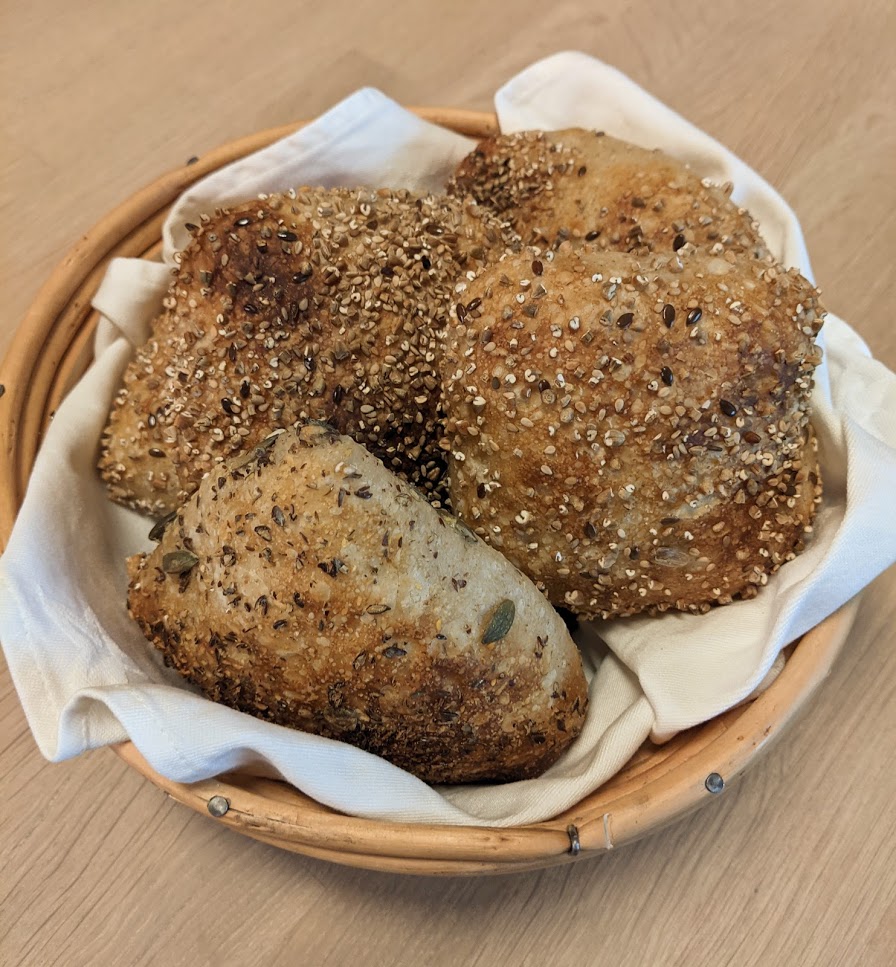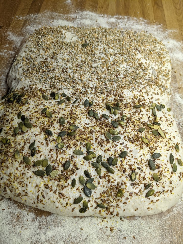 På bakedagen: Ovn, bakestål og langpanne (i nederste rille i ovnen) varmes opp i 1 time ved 250°. Ta deigene ut i fra kjøleskapet, strø litt maismel eller semulegryn på kjøkkenbenken. Snu boksen på hode og la deigen komme ut på benken. Strø ønskede frøblanding på deigen du har lagt på benken. Bruk en deigskrape til å dele deigen opp i 12-14 stykker, stykkene legges forsiktig på brett. Du må bruke vann på deigskrapen deigen ikke kleber seg til deigskrapen. Når du har fylt et brett er det klart for steking.