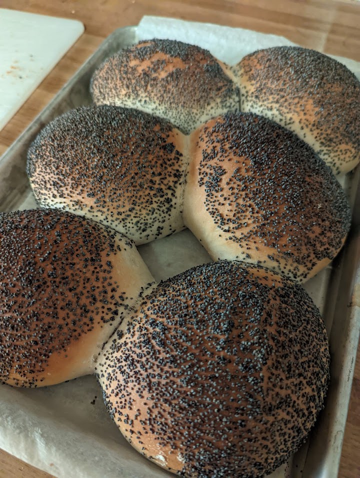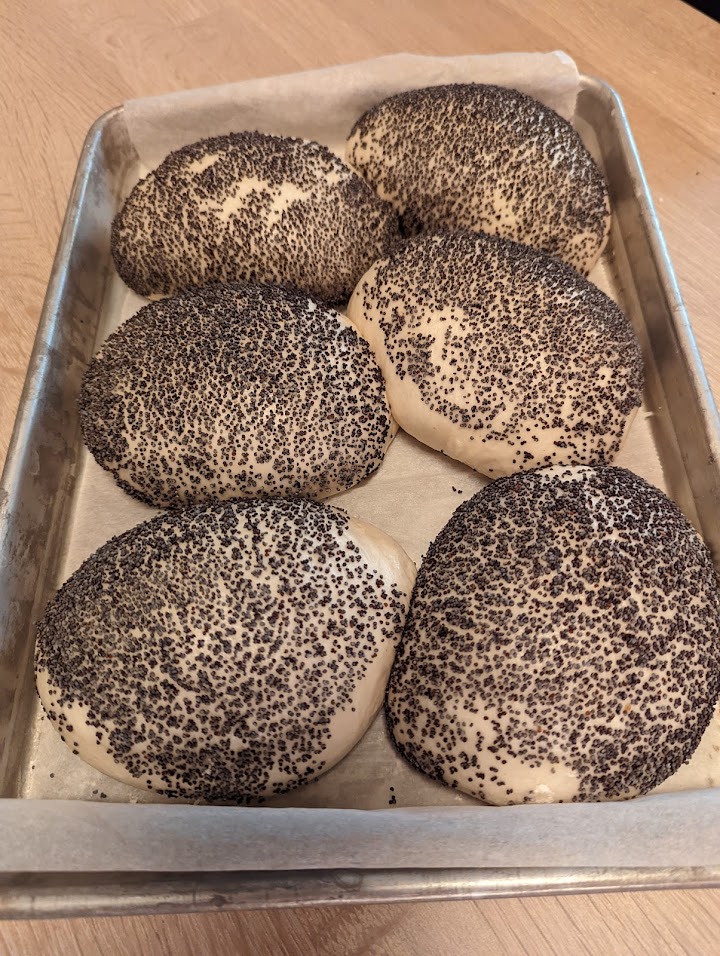 Del deigen opp i 12 emner, for den litt avlange som små brød. Pensles med melk og vendes i valmuefrø.